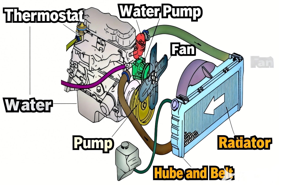 (1) Componentes del sistema de refrigeración: El termostato controla la ruta de circulación del refrigerante (circuito pequeño para un calentamiento rápido, circuito grande para una mayor disipación de calor); la bomba de agua, el radiador y el ventilador garantizan la eficiencia del flujo de refrigerante y la capacidad de disipación de calor.